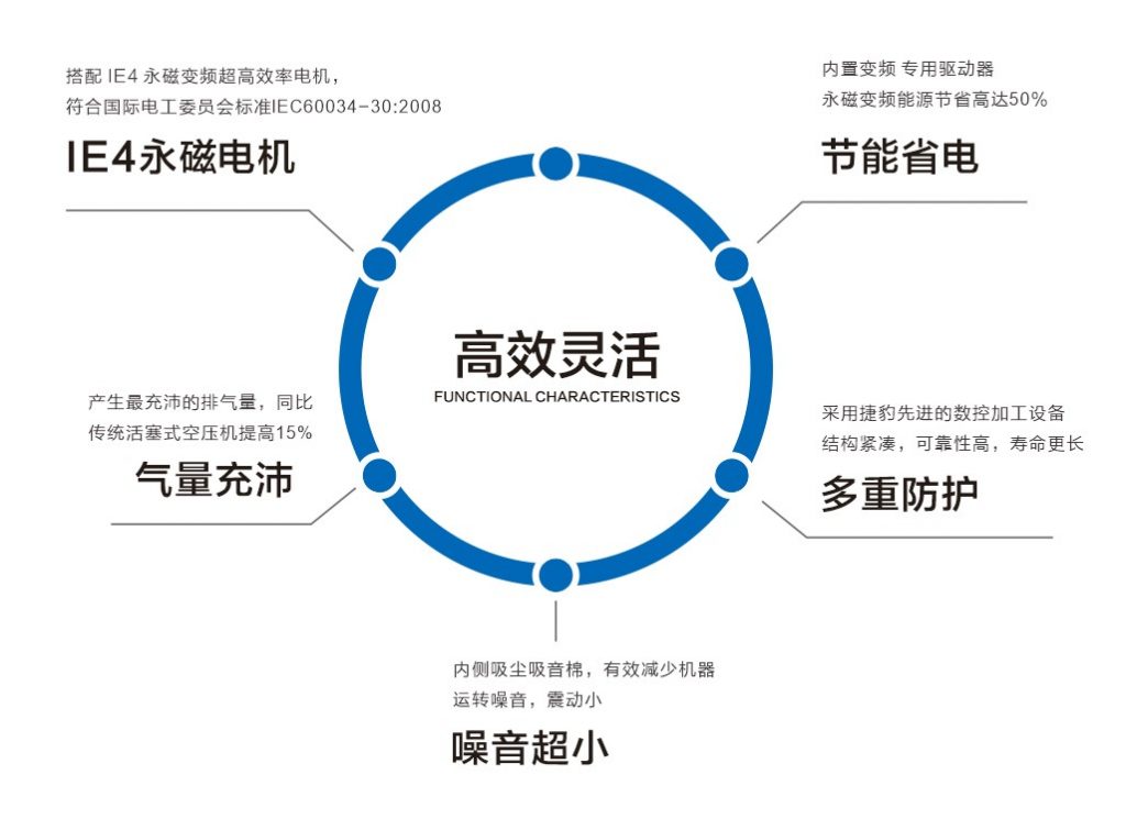 捷豹獨(dú)創(chuàng)集成一體式螺桿機(jī)頭: 采用捷豹最新科技,融合了螺桿機(jī)頭、油氣分離、永磁電機(jī)三位一體,最大程度的集成一體化。大大減少了螺桿機(jī)的組成部件,最少的組成部件可以最大化提高維護(hù)效率,最小化使用空間,為您節(jié)省安裝使用空間。同時(shí)配備了 IE4 永磁電機(jī),看似小巧,內(nèi)涵不減,超高效率的螺桿機(jī)頭,達(dá)到國(guó)家一級(jí)能效,為您和您的工廠大大節(jié)省電費(fèi)。